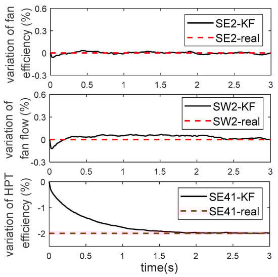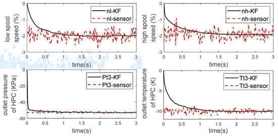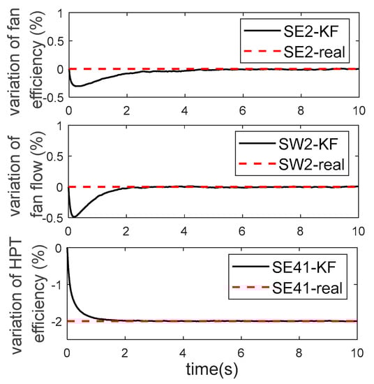It can be seen that the Kalman filter can accurately estimate the efficiency degradation of the high-pressure turbine components at 2% within 1.5 s, and the estimation accuracy of other health parameters is also within 0.1%. At the same time, the estimation of the measured values also has high accuracy.