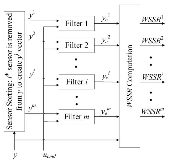 In this section, the AEMM is combined with the Kalman filter bank to design a fault diagnosis scheme for single sensor and double sensors. In the case of the single sensor fault, filter banks are designed. Each filter isolates one of the sensors, and the output estimation is carried out by using the remaining sensor information. In the case of the two sensor faults, they are grouped and the single-sensor diagnosis mode is adopted.