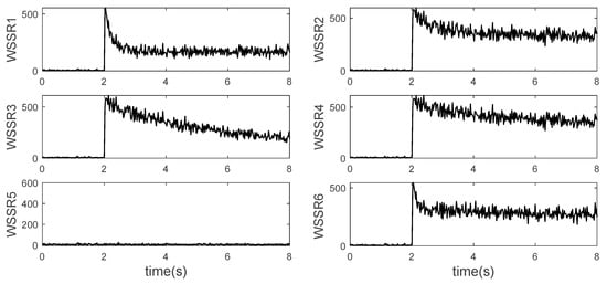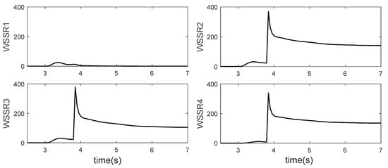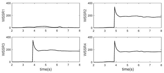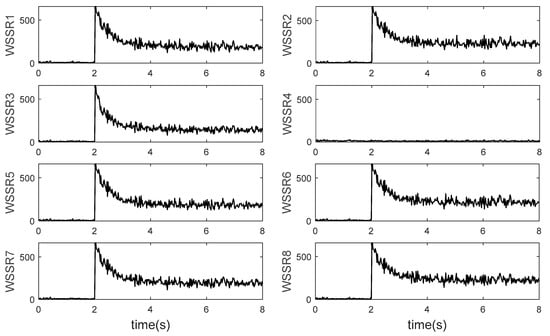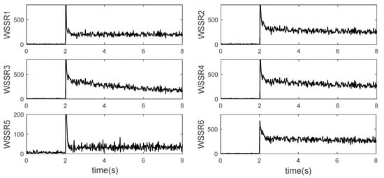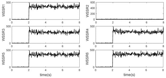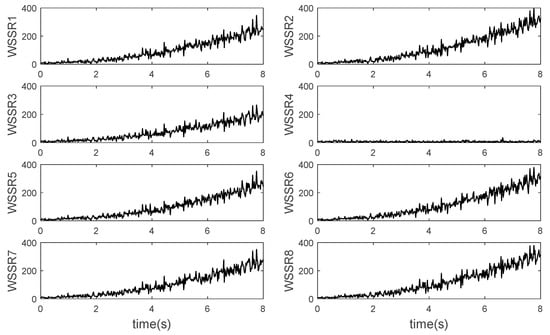 Select sensor measurement parameters as . Compared with AEMM established previously, the four additional sensors are the total pressure and temperature at the fan outlet and the total pressure and temperature at the mixing chamber inlet. State quantity and health parameters remain unchanged. The noise matrices Q and R are reselected, and 8 Kalman filters are designed. The input of each filter is another 7 measured values. Set the efficiency of high-pressure turbine components to degrade by 2%, and obtain the steady-state deviations of 8 sensors under normal conditions: , , , , , , , . At 2 s, a certain bias signal is injected into the outlet temperature sensor of the high-pressure compressor (). As can be seen from Figure 8, except for the fourth filter, the WSSR value of all the other filters underwent drastic abrupt changes and then gradually approached a stable value, while the WSSR value of the fourth filter remained at a low level. Therefore, it can be determined that the fourth sensor, the temperature sensor , has failed. Then, a drift fault of 1 K/s is injected into the sensor. As can be seen from Figure 9, the WSSR of the other filters also drifts, while only the fourth filter remains unchanged. Therefore, the designed Kalman filter bank can diagnose all kinds of single sensor faults effectively.