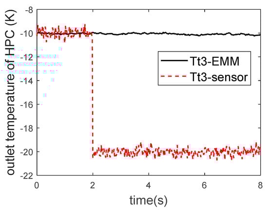 Subsequently, this filter is used to re-estimate the degradation, and the result is shown in Figure 10, which is in line with the actual situation. Finally, the actual degradation is brought into the on-board AEMM to reconstruct the fault sensor signal, as shown in Figure 11, where the short red line is the fault sensor signal, and the solid black line is the corresponding sensor signal reconstructed from the on-board model.