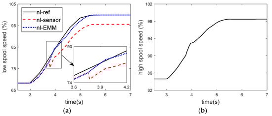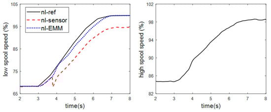 Use the variation rule of low spool speed and nozzle throat area optimized by target shooting method in 4.2 as control instructions for the acceleration process, and the acceleration control scheme of low spool speed closed-loop and nozzle throat area open-loop is adopted. The Kalman filter bank is designed by selecting sensors of low spool speed, high spool speed, high-pressure compressor outlet total pressure and total temperature, which constitute the sensor fault diagnosis module. Next, the sensor fault simulation in the acceleration process is carried out. The result is shown in Figure 19, Figure 20, Figure 21 and Figure 22.