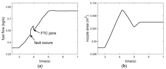 Changing curve of control quantity in acceleration FTC process. (a) Fuel flow. (b) Nozzle area.