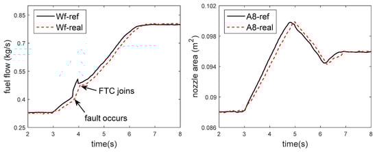 The low spool speed, the high spool speed, the total pressure and the total temperature at the outlet of the high-pressure compressor are also selected for fault diagnosis and design. FTC results are shown in Figure 25, Figure 26, Figure 27 and Figure 28. At 3 s, the acceleration control starts. At this time, the speed of the engine and the speed of the on-board model is both good for tracking instructions. At about 3.8 s, a 5% bias occurs to the low spool speed sensor, as shown by the red dash in Figure 26. The controller rapidly increases the fuel flow control instruction, as shown in the solid black line in Figure 28. However, different from the result in 4.3, since the change rate of the actuator has reached the limit at this time, the actual fuel volume does not increase dramatically but maintains the maximum rate of increase. As shown in Figure 25, the low spool speed bias is quickly diagnosed by the Kalman filter, and the diagnosis effect is noticeable. At about 4 s, the reconstructed signal of the airborne model is switched for FTC and the fuel flow control instruction falls back. At 6.8 s, the reconstructed low spool speed signal keeps up with the control instruction and tends to a steady state, and the engine accelerates successfully. The fault diagnosis and signal reconstruction can be done within 0.2 s, and the whole FTC process can be carried out in less than 3 s. Parameters before and after the acceleration process are shown in Table 1. In general, the proposed scheme has good fault diagnosis ability and fault tolerance ability. The acceleration control under sensor fault is successfully realized, and the acceleration process does not cause a big change of engine state. Therefore, the validity of the FTC scheme proposed in this paper and its compatibility with the real-time embedded platform has been proved.