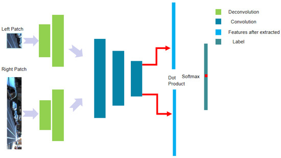 We propose a type of CNN neural network with deconvolution layers [30] to adaptively expand the size of the input patches by referring to the GA-Net feature extraction. We introduce deconvolution at the beginning of the convolutional network and then perform the convolution operation. Deconvolution plays the role of up-sampling. The feature size after deconvolution is larger than the feature size before deconvolution. The backbone of the proposed network is based on the Siamese neural network [31] and MC-CNN network [19], and we refer to the previous part of MC-CNN and combine the network architecture with the Siamese neural network. The basic structure of the proposed network is shown in Figure 2. As can be seen, the overall network structure can be divided into four modules: image patch input module, deconvolution module, convolution module with dot product, and the Softmax-based loss calculation module. In the process of post-processing, we use the internal check method for checking the left and the right consistency, and use the ray filling method for filling invalid pixels. The flow chart of the overall algorithm is shown in Figure 3.