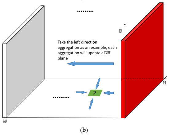 where is the position of the cost cube, and are the predefined penalty parameters, represents the matching cost obtained directly from the convolution network, and is the cost after aggregation whose initial value is the output of the neural network, represents the minimum cost of the position in the cost cube for all possible disparity . After the aggregation, one plane will be updated. Similarly, for the up and down directions, the corresponding plane will be updated. Finally, the aggregate values of the four directions are added as the final DSI.