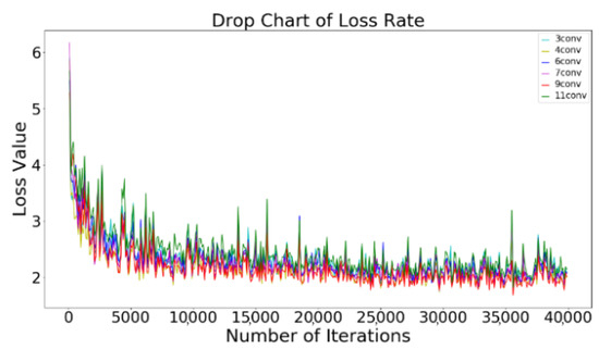 Figure 11 shows the loss curve of each network configuration. We can see that the network with nine convolutional layers and four convolutional layers converges better than the other configurations. Table 3 shows the percentage of missing matching pixels with a threshold of 2, 3, 4, 5 in the test set, in which 37 × 37 represents the size of the input image block. The threshold means the absolute difference between the estimated disparity and the actual disparity. We can see that the network with nine convolutional layers configuration performs better for 2, and 3 pixel errors (with percentages of 10.86% and 8.07%), whereas, the network with four convolution layers configuration performs better for 5 pixels error (with a percentage of 6.01%). For the threshold of 4, the performances are the same as each other. (the percentage is 6.82%).