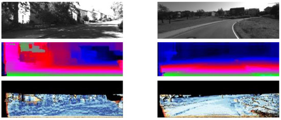 The KITTI stereo dataset is filmed by calibrated cameras while driving, such as Figure 10. The content of the dataset mainly includes roads, cities, residential areas, campuses, and pedestrians. The 3D laser scanner can obtain relatively dense distance information, and the depth map of the scene obtained by 3D laser scan can be used as the real disparity map after calculation. The KITTI platform provides 3D point cloud data obtained by 3D scanning lasers, corresponding calibration information, and coordinate transformation information, from which we can generate the real disparity maps.