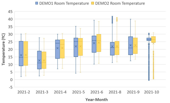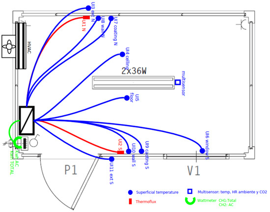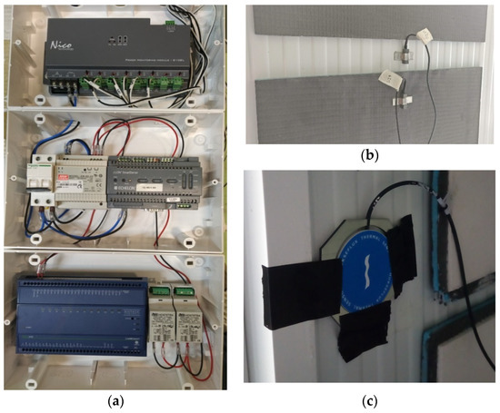 - PLC—Distech ECL 400: it is used as an analog input module for the heat flux meters and the temperature probes. This PLC equipment has the advantage of being programmable for the most suitable monitoring strategy to the study intended.