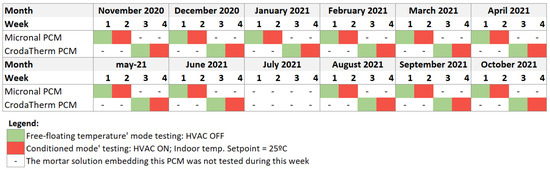 - Monitoring campaign where 2 PCMs (i.e., CrodaTherm [10] and Micronal [11]) embedded into mortar solutions were alternatively studied considering both a free-floating temperature mode (i.e., no space conditioning system activated) and a conditioned mode (i.e., PCM supporting the active operation of the space conditioning system). Winter, summer, and mid-seasons were covered by the monitoring phase.