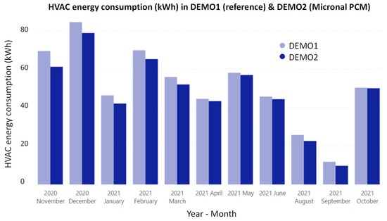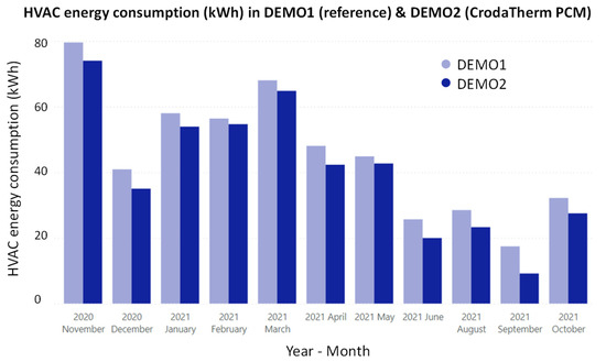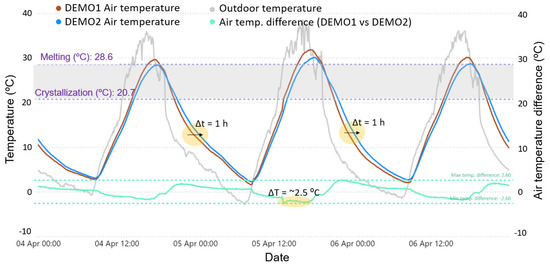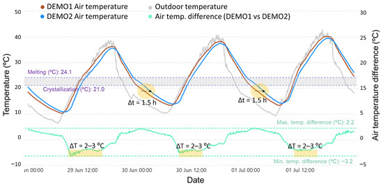 - This trend was observed both during winter and summer months under controlled-temperature (conditioned mode) operation because the targeted indoor comfort conditions intersected the phase change range of the selected PCMs and triggered their partial activation (which did not happen under free-floating temperature mode).