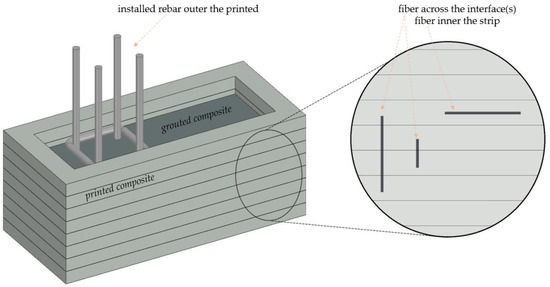 Among existing digital concrete fabrication methods, extrusion-based 3DCP is the most widely used and developed technique. Besides the studies of shape retention and the mix formulation [7,8,9], the reinforcements play an important role in 3D printed components to meet structural safety requirements. The printed output has low toughness due to the layerwise fabrication process and lack of reinforcements. There are layers and filaments from the printed nozzle, stacking, and bonding to form a 3D object, between which there are interfaces during the stacking process of the 3DCP, and the interfaces are the weakness zone [10,11,12] or, worse contact [13] area, requiring reinforcement. Several studies have been conducted to improve the layer adhesion by controlling the moisture, varying the printing speed and layer thickness, or brushing black carbon–sulfur or concrete glue.