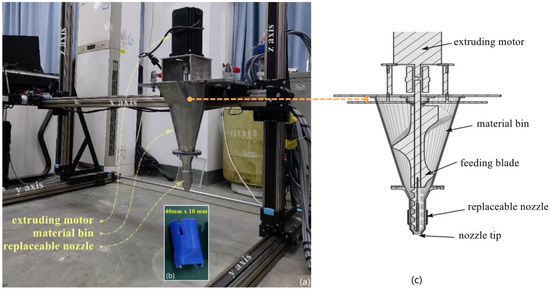 Figure 2. Three-dimensional printing device: (a) 3D printer with a round nozzle tip, (b) the rectangular nozzle tip of 40 × 10 mm, and (c) design of the printing head.