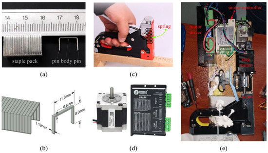 Figure 3. Staples and the automatic staple-inserting device: (a) photo of staples, (b) dimensions of the staple, (c) original stapler for wood fastening, (d) a step motor and its driver, and (e) the upgraded SIA.