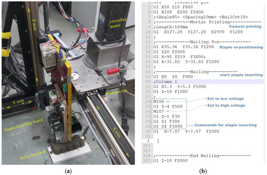 Figure 4. The 3DCP-SIT system: (a) installation of the SIA on the printing nozzle and (b) the upgraded G-code, including commands for both mortar printing and staple insertion.