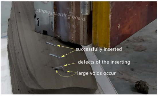 There were many gaps around the staples, as shown previously, caused by the insertion process. The voids could not be avoided but could be minimized. Voids also occurred around the penetrated rebar [39] and embedded steel wire [13]. Marchment and Sanjayan observed that the voids were smaller at the deeper point of their penetrated rebar, indicating better bonding status between the rebar and the composite [39]. Moreover, as shown in Figure 4a, the staples were packed with a film of glue that could further decrease the bonding (the packed steel fibers also have the outer films). The voids and films led to insufficient bonding (i.e., weak contact [13]). The first solution is to minimize the voids by optimizing the inserting parameters or introducing other techniques to the SIA, such as vibrating the staple ultrasonically. The second is to enhance the contact area between the staples and composite, similar to the coating technique. Sun and Gao coated rebar with sand and improved the residual bonding strength by 23% compared to rebar with a smooth surface [33]. The third is the cementitious material. A study [53] showed that the bond quality is highly dependent on the chemical interaction between the cable surface and matrix mortar and the flow behavior of the matrix around the cable. The mortar with high fluidity could fill the gaps, but high fluidity leads to low ability to build. Fortunately, it is possible for large-scale printing with a large nozzle and long loop time between two layers to achieve hardening, planted by large staples. Vibrations and the high-fluidity printable material can minimize the size of the voids.