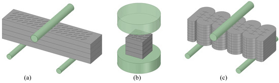 Figure 7. Mechanical tests: (a) three-point bending for IR- samples along the Z-axis, (b) compressive test for IR- samples loading along the Z-axis, and (c) three-point bending for IL- samples.