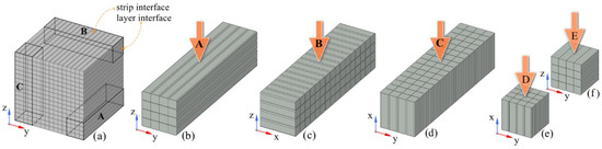 As mentioned in Section 1 and illustrated in Figure 8a, there are interfaces between the layers and strips. The fabricated prisms and flexural loading can be A, B, or C, as shown in Figure 8b, Figure 8c, or Figure 8d, respectively. The IR- samples for flexural and compressive tests belong to type-A and type-E, as in Figure 8b,f, respectively. The IL- samples were for type-B (Figure 8b). Other studies on (Figure 8d) and (Figure 8e) are discussed in later sections.