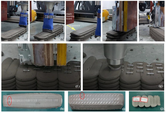 The fabrication processes of all the specimens are shown in Figure 9. The IR- series samples were prepared as shown in Figure 9a–e, with the rectangular nozzle tip, from extruding cement in (a) and (b), switching the nozzle tip to the SIA in (c), starting staple insertion in (d), and finally to finishing the insertion of one layer in (e). The IL- samples were prepared with the SIA and round nozzle tip in turn, as shown in (f) and (g), respectively. The typical samples are shown in (h), (i), and (j), with successfully inserted staples being 98.4% and 98.1% of the staples and two failed staples circled in (h) and (i), respectively. This proved the staple inserting mechanism can be fully automated in bulk manufacturing. The inserting operation extended the fabricating time. Further studies can be conducted on high-speed inserting: staple jetting, which is possible on large-scale printing activities, or developing an inserting mechanism along the material extrusion, as discussed in Section 4.7.