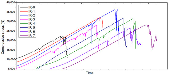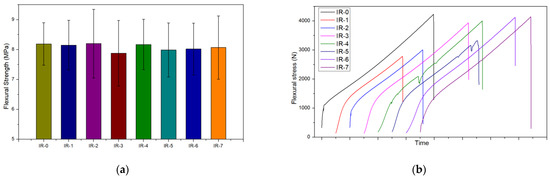 Figure 10. Data of the three-point bending tests on the IR- series samples. (a) Flexural strengths and (b) flexural stresses of typical testing samples, with time axis offsets.