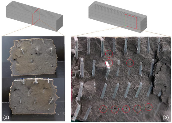 The results can explain that the short staples scattered without overlap and functioned separately by locking a narrow cement inside its pin bounds, where there were gaps around the pins in the composite. First, the staple was too short (a length of 11 mm) to reinforce a large amount of composite, while embedded steel cables improved flexural strength by 290%, inserted corrugated fibers improved the strength by 130% [42], and steel mesh achieved 170–290% improvement [43]. Second, in references [14,16,17,18,19,20,21,44,45], short fibers were mixed before the printing. These mixed fibers were distributed close, near, overlapped, and aligned [46], then functioned together to improve the toughness by 63% [47]. However, in this study, the staples were scattered in the composite and did not overlap much, and thus functioned separately. Third, there were gaps around the staple pins, as shown in Figure 11b, and the bonding was much lower than that of the fibers mixed in the mortar.