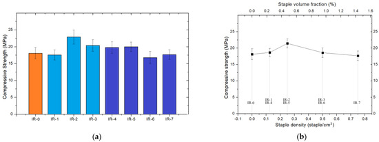 Figure 12. Compressive strengths of the IR- samples. (a) Strengths vs. sample type and (b) strengths vs. staple density/volume fraction.