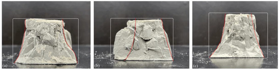 Typically, printed structures have three dimensions of compressive strength anisotropy [48,49]. As in this study, the Z-axis gave the lowest value because the sandwich-like layers were orthogonal to the loading direction. Thus, the testing sample resulted in many cracks and broke into pieces under compressive load. Random cracks still occurred when the IR- samples were reinforced with staples, as proved by the accidental drops in the stress curves, as shown in Figure 13. The central part of the specimen was locked by the staples and remained together as the failure modes shown in Figure 14a–c. The staples contributed to the compressive strength by holding the composite from horizontal extension when under vertical load. To conclude, the inner locking staple could improve the compressive strength along the Z-axis by the inner locking effect.