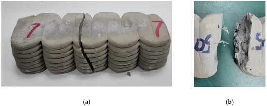 Figure 15. Failure of the IL- samples: (a) a neat break of IL-0 samples without staples, (b) regular breaks of the IL-1/3 samples.