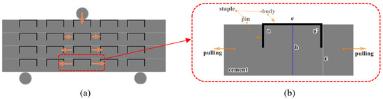 This study aimed to investigate the material locking effect between the staple pins. All the staples were inserted vertically to the printed layers, as shown in Figure 5. The flexural and compressive loads were conducted vertically to the printed layers. When a stapled beam was under a bending load (such as a three-point bending test), the inner composite with a staple was under a pulling operation, as shown in Figure 16a. To analyze the mechanism of the staple reinforcement, a simplified model was built, as shown in Figure 16b. There are gaps around the staple pins at positions a and a . Line b represents the strip interface. This structure is under a pulling operation. The symbols f a , f b , f c , f e , and f f represent the maximum failing stresses under pulling loads at positions a, b, c, e, and f, respectively; f a is determined by the composite strength at positions a and a around the staple pins when the pins are pulled out of the composite; f b represents the interface bonding stress on the connected strips; f c is obtained when the staple body fails under the pulling operation; and f e represents the failure of point e, where the staple pin is a defect of the cement. In addition, f f corresponds to pure composite failure.