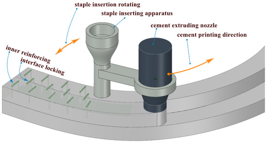 Therefore, the 3DCP-SIT system still needs hardware upgrades to increase the insertion speed, reducing the time interval between the printed layers. Furthermore, it can insert staples while the mortar is being extruded, as illustrated in Figure 17, especially for large-scale printing, which needs a large staple size. It is technically feasible that the SIA is the second printing nozzle, and the dual- or multiple-printheads have been successfully utilized in thermoplastic [54], food, or drugs. More techniques could be utilized to achieve further possibilities, such as vibrating the staple, brushing glue on the staple, rotating the insertion angle, or controlling the staple density. The upgraded corresponding software can handle the printing and insertion operations by reading the CAD geometry sketch with staple information, including the locations and directions.