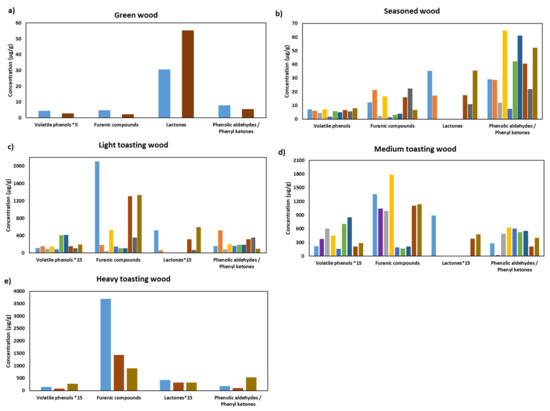 Graphical representation of the averages of the sum of the compounds in wood volatile phenols, furanic compounds, lactones and phenolic aldehydes/phenyl ketones by wood species, after the different cooperage treatments: (a) green, without treatment; (b) seasoned (carried out in oven and in open air); (c) light-toasted (light toasting, 190 °C for 10 min, 160–170 °C for 20 min and for 35 min); (d) medium-toasted (medium toasting, 180 °C for 45 min, 200 °C for 15 min and 35 min, 210 °C for 20 min and 45 min, and medium plus toasting); (e) heavy-toasted (heavy toasting and 250–260 °C for 27 min).