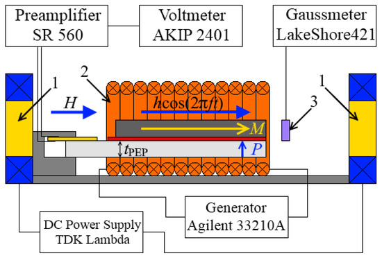 Schematic diagram of the experimental setup: 1—electromagnet’s poles; 2—excitation coil; 3—magnetic field sensor. Directions of the magnetization M in the MAE layer and the polarization P in the PEP are shown.