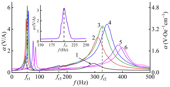The field dependence of at a resonance frequency, shown in Figure 6b and Figure 7b, demonstrated the existence of the optimum magnetic field (Hmr1, Hmr2), where the ME voltage coefficient had its maximum.