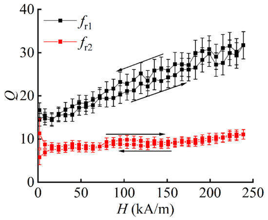 Field dependences of the quality factor Q at resonance frequency fr1 and fr2 obtained for sample S1. Arrows denote the direction of field change.