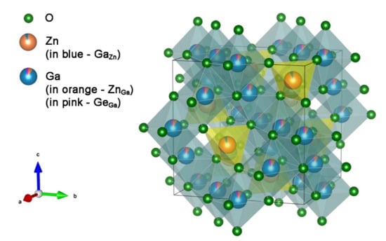 Structural model of ZGO:Cr and ZGGO:Cr. When x = 0.1 Ge replaces Ga atoms, as represented by the pink portion on Ga atoms. The model was obtained using the free software VESTA and the data from Allix et al. [13].