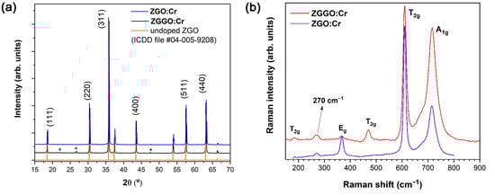 Figure 2a displays typical X-ray diffractograms and Raman spectra of Cr-doped ZGO and ZGGO pellets. As identified, only the ZGO crystalline phase was observed and no other crystalline phases were present, apart from residual silica contamination likely arising from the mixing procedure of the precursors using the agate ball mill. The lattice constants of the doped spinels were estimated as and for the ZGO and ZGGO hosts, respectively, which are in line with the values reported in the literature [3,8,9,10,11] and close to the reference value of 8.33 from ICDD #04-005-9208 card, which is included in the Figure for comparison purposes.