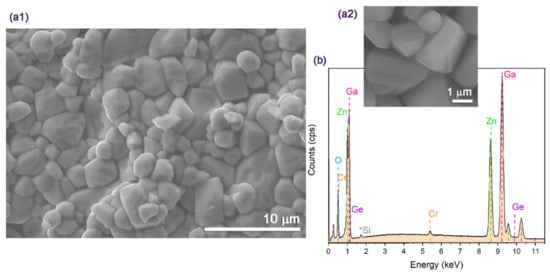 The morphology of the ZGGO:Cr pellets was assessed by SEM. As presented in Figure 3a, a mean grain size of 1.8 ± 0.6 μm was estimated, which represents the majority of the pellet sample. However, larger grains were also observed with sizes in the order of dozens of micrometres. The EDS spectrum depicted in Figure 3b evidences the presence of all the expected elements in the sample: Ga, Zn, Ge, O, and Cr.’
