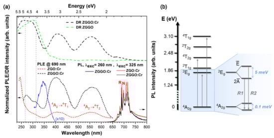 (a) (top) DR spectra of non-intentionally doped (green dashed line) and chromium-doped (black dashed line) ZGGO samples; (bottom) RT PLE (@ 690 nm) and PL (λexc = 325 nm) spectra of ZGGO:Cr (black lines) and ZGO:Cr (red lines) samples, respectively; and a PL spectrum of ZGGO:Cr (blue solid line) at band-to-band excitation. (b) Schematic representation of the energy levels of Cr3+ in octahedral sites and corresponding splittings (not to scale) of the fundamental and first excited states under the interplay of a trigonal crystalline field and spin–orbit interaction.