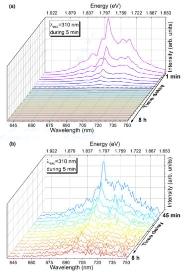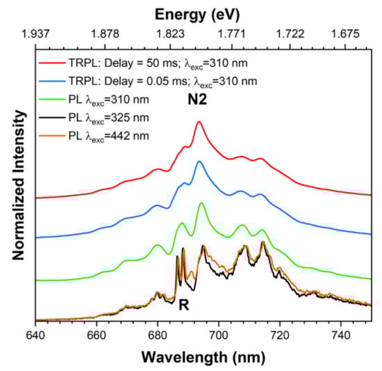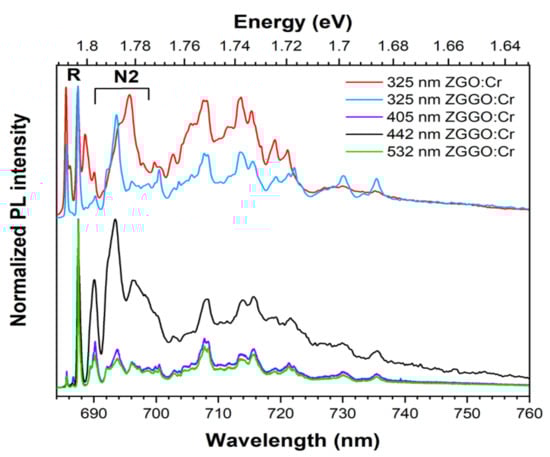 At RT, excitation of the ZGO:Cr and ZGGO:Cr samples into the band edge, as well as defect levels and higher excited Cr3+ levels, result in a rapid relaxation to the emitting state, as seen in the excitation-dependent PL spectra shown in Figure 5. It is noteworthy that the relative intensities of the observed lines, their peak positions, and lines’ asymmetry show a dependence on the excitation wavelength, suggesting different origins for the recombination processes superimposed in the same spectral region. This is clearlyidentified in Figure 5 for the R- and N2-lines, as highlighted by the dashed vertical lines.