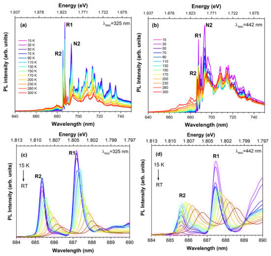 Figure 8a,b illustrate the temperature dependence of the Cr3+ emission observed in a ZGGO:Cr sample obtained upon excitation in the defect absorption band (325 nm) and intraionic transition (442 nm). For both cases, a noticed thermally populated anti-Stokes emission is observed with increasing temperature. Additionally, a low-energy shift of 2.6–3.0 meV for the R- and N-lines peak position is seen occurring with increasing temperatures from 15 K to RT, accompanied by line broadening due to the contributions of strain and impurity phonon coupling. By using 325 nm of excitation, the overall intensity of the superposed Cr3+-emitting centres decreases in the studied temperature range, reaching a RT value of 45% of its original value at 15 K. On the contrary, upon intraionic excitation on the absorption band (442 nm), the intensity of the overall emission decreases between 15 K and 90 K and then increases for higher temperatures, likely due to thermal population mechanisms. The overall intensity at RT corresponds to 95% of its original value at 15 K. This behaviour also supports the presence of multiple Cr3+-related optical centres, as well as provides information about the existence of different thermal de-excitation paths under the different wavelength excitation conditions employed. Moreover Figure 8c,d also show a distinct temperature behaviour for the integrated intensity of the R-lines when the excitation is performed either by 325 nm or 442 nm photons. In particular, and as shown in Figure 9, using 325 nm of excitation, the intensity of the R1-line decreases over the entire temperature range, while the R2-line intensity increases up to about 100 K and decreases thereafter likely due to further non-radiative processes. Under intraionic excitation (442 nm), the intensity of the R1-line decreases appreciably up to 60 K and then evidences a slight increase up to RT. At this excitation, the intensity of the R2-line always increases in the temperature range assessed. The observed behaviour reveals the spectral complexity of the presence of several optically active Cr3+ in the ZGGO host that emit in almost the same spectral region and are excited by close energies. Furthermore, the increase in the intensity of the R-lines indicates the existence of thermal populating processes between the different optical centres.