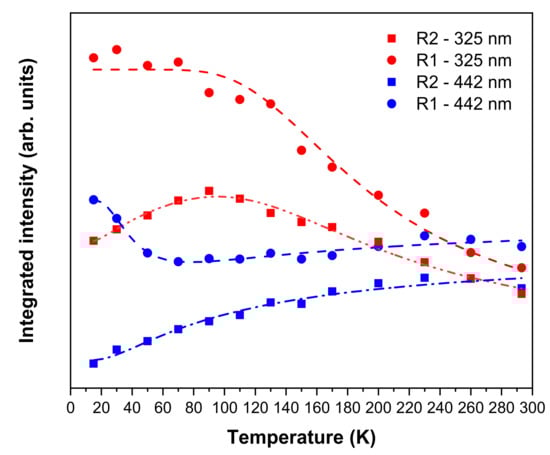 Temperature dependence of the R-lines’ integrated intensity obtained under 325 nm and 442 nm photon excitation and correspondent fittings according to Equations (1) and (2).
