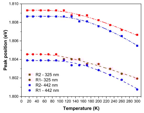 Temperature dependence of the R-lines’ peak position obtained with 325 nm and 442 nm photon excitation, and correspondent fittings according to Equation (3).