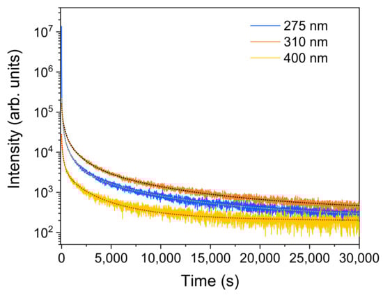 where 0 < δ < 1 denotes the dispersion factor (δ = 1 is equivalent to the simple exponential decay) and n = 4 in the case of the decay acquired after the initial excitation with 310 nm and with 275 nm, while n = 2 for the 400 nm case.