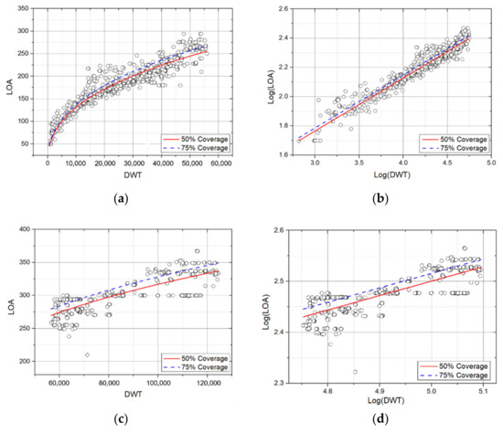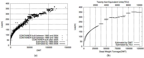 In Japan, trends in ship size have been updated approximately by a 10-year cycle. Katayama er al. [10] analyzed the interrelationships between various common ship dimensions, such as length overall (LOA), breadth (B), and gross tonnage (GT), for the design and planning of port facilities using regression analysis. Kiyoshi and Yoshida [11] analyzed the interrelationships of various variables for ships in Japan and other countries. To establish standard linear design conditions according to ship type and size for the planning and design of port facilities, Ajiki er al. [12] analyzed the major dimensions using information about ships registered in Japan and Lloyd’s Register of Ships. The correlation between the length overall (LOA), breadth (B), draft (d), and tonnage was analyzed for eight types of ships. Akakura er al. [13] performed statistical analysis to determine standard ship designs of the LOA, B, length between perpendiculars (Lpp), displacement, and d using ship specifications from Japan and Lloyd’s registered ship information. Takahashi er al. [9] used information from the Lloyd’s Maritime Intelligence Unit and ship specifications from Japan. Regression analysis was performed on the correlation between the main dimensions (LOA, Lpp, B, and d), GT, and deadweight tonnage (DWT) according to nine types of ships, including cargo ships, container ships, tankers, roll-on/roll-off ships, automobile carriers, liquefied petroleum gas ships, liquefied natural gas ships, passenger ships, and ferries. Inoue and Akakura [14] analyzed changes in ship design according to the year of construction by subdividing the main dimensions of the target ships. In particular, for container ships, the TEU was presented parallel to the regression trends. Figure 1a presents the DWT–LOA (m) graph, while Figure 1b presents the TEU/DWT–LOA regression graph.