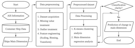 In this study, analysis was performed based on the AIS data of ships around the world registered in International Maritime Organization (IMO) number up to 31 December 2020. The data were refined to be suitable for analysis by preprocessing the target data [20]. In addition, using k-means clustering, the ship age was added to the relationship with the main dimensions of the ship data. Ships tend to become larger in recent years, so if this is reflected, changes in ship dimensions can be reflected more effectively. Based on the clustered data, a regression analysis of the ship dimensions was performed, and the change in the main dimensions of container ships was derived. A flowchart of this study is presented in Figure 2.