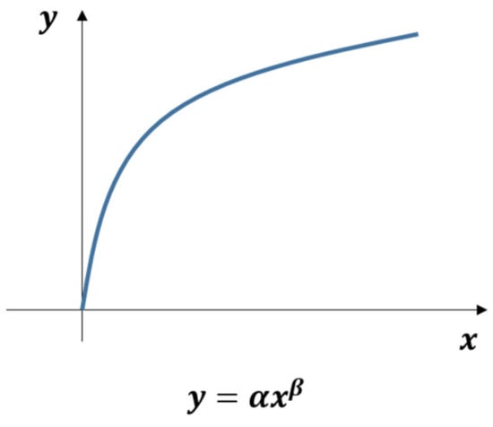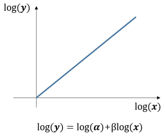 where denotes the y-intercept value log-transformed graph, and is the slope of the log-transformed graph (Equations (1) and (2)). The log-transformed graph takes the form of a linear graph, as illustrated in Figure 4.