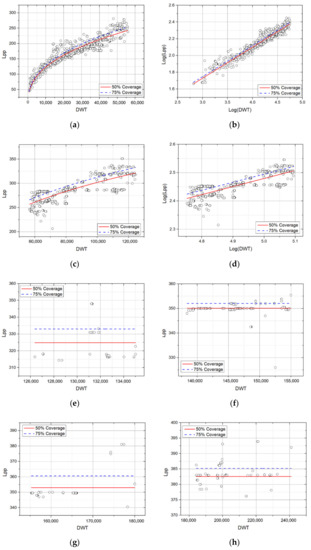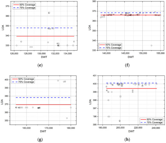 As a result of the analysis for each cluster, 0–55,000 DWT (~5000 TEU) was classified in Cluster 1, 55,000–125,000 DWT (~12,000 TEU) were classified in Cluster 2, and 125,000–241,000 DWT (~12,500–24,000 TEU) were classified in Cluster 3. Table 6 shows the results of the regression equation for each cluster according to the coverage rate 75%. As a result, in the graph of Cluster 1, the variation in LOA due to the increase in DWT was larger than in Cluster 2. Cluster 3 was analyzed as a stepwise graph suitable for average value analysis. Figure 12 is a graph of regression analysis by clustered data for DWT–LOA.