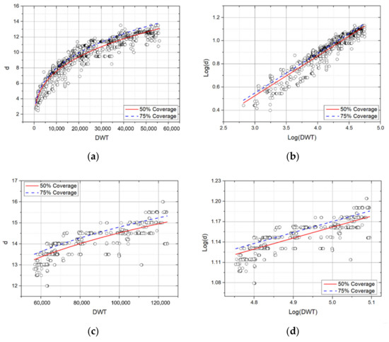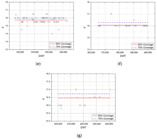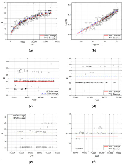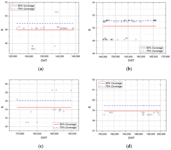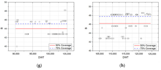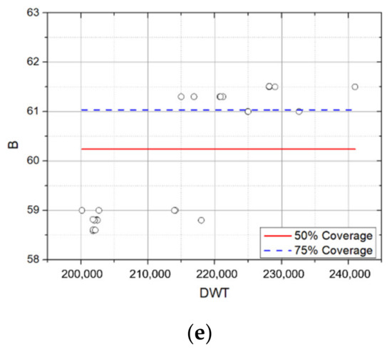 In the Recommendations for the Design of the Maritime Configuration of Ports, Approach Channels, and Harbor Basins provided by Puertos del Estado [17], which is a port facility management agency in Spain, 95% of the coverage rate of the regression residual distribution was used as the standard of the ship’s main dimensions. Therefore, standard ship specifications were presented by setting 115% (or 110%) as the upper characteristic standard and 85% (or 90%) as the lower characteristic standard.