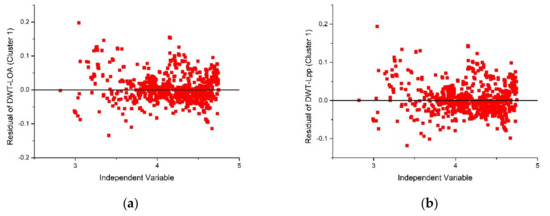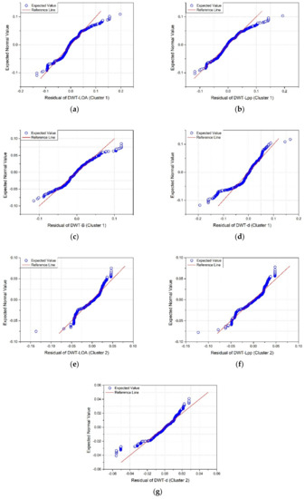 In this study, to examine whether the results of the linear regression analysis of the log-transformed graph above were properly derived, the equal variance of the residuals and the normality of the distribution were reviewed. The analysis result of the Normal Q-Q plot is shown in Figure 17. Homoscedasticity refers to the homogeneity of variance, and it means that scores are equally spread across different groups to be compared. As the results show, the residual distribution of Cluster 1 and Cluster 2 was analyzed to have homoscedasticity.