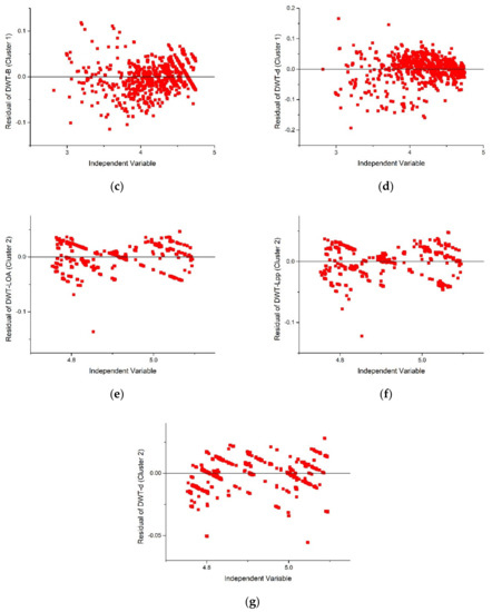 Results of log transformed linear regression graph residual homoscedasticity. (a) Deadweight tonnage (DWT)-Length overall (LOA) graph of Cluster 1; (b) DWT-Length between perpendiculars (Lpp) graph of Cluster 1; (c) DWT-breadth (B) graph of Cluster 1; (d DWT-draft (d) graph of Cluster 1; (e) DWT-LOA graph of Cluster 2; (f) DWT-Lpp graph of Cluster 2; (g) DWT-d graph of Cluster 2.