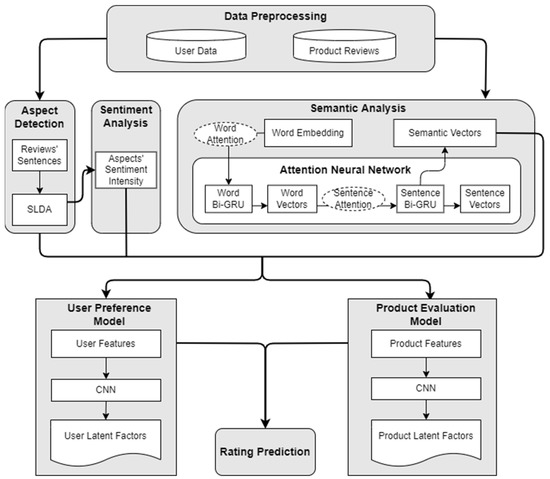 First, we set the data filtering criteria for the product reviews of users to select the eligible users and reviews, and then conducted pre-processing. Regarding the aspect detection module, the aspects of the sentences in the reviews were analyzed to infer the wider aspects of the article and then build the aspect embedding vector. Sentiment analysis was used to calculate the sentiment intensity in each aspect of the reviews. The sentiment feature vector of the aspect was then built via the neural network method. The semantic analysis uses a hierarchical attention network (HAN) to calculate the weights of words and sentences in user and product reviews. The resulting weights are used to generate the aspect semantic vectors of the users and products. In the user preference model, the aspect vectors, aspect sentiment scores, and aspect semantic vectors, as extracted from user reviews, are integrated and fed into a user-based CNN to generate the user latent factors. Similarly, the product evaluation model generates product latent factors in the same way as the user preference model. Finally, the matrix factorization (MF) method was used to integrate the latent factors of users and products to predict the future products that users may be interested in.